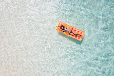 Top above high angle aerial drone view of fit slim slender sporty wealthy, rich attractive girl floating lying on rubber mattress sea water enjoy joy calm tranquil relax famous destination rout