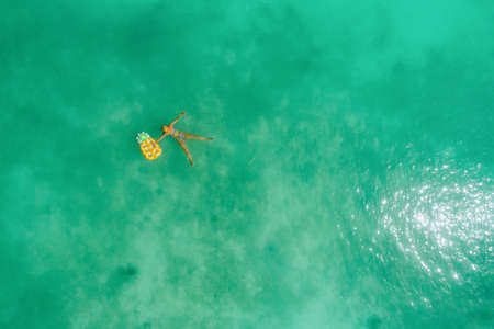 top aerial view of young woman enjoy swimming on floating inflatable tube in sea with cleared water, happy in summertime and vacation or long weekend swimming at sea