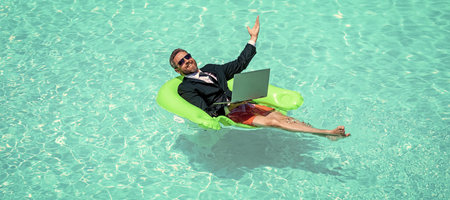 cheerful business man trading online. business man trading online in swimming pool. business man trading online with laptop. photo of business man trading online in suit.