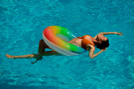 Summer Vacation. Enjoying suntan. Woman in swimsuit on inflatable circle in the swimming pool.
