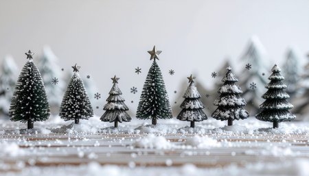 A row of small, snow-dusted Christmas trees with star toppers, creating a charming winter wonderland scene, perfect for holiday themes.