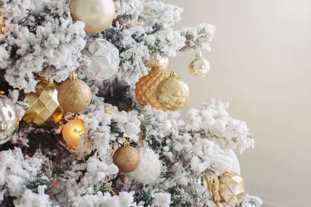 Decorated Christmas tree for New Year. Golden and white ornaments with lights and artificial snow. Background for holiday greetings with copyspace for text. Toned with retro film filters.