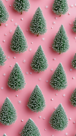 A collection of small, snowy Christmas trees is artfully arranged against a soft pink backdrop, creating a festive atmosphere for holiday settings or crafts.