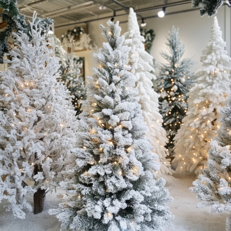 A stunning arrangement of snowy Christmas trees adorned with warm white lights creates a magical festive atmosphere perfect for holiday celebrations.