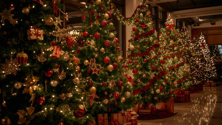 Row of decorated Christmas trees with red ornaments outdoors