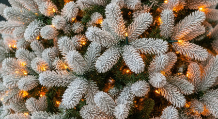 A detailed close-up of a flocked Christmas tree, showcasing its textured branches and the soft glow of warm white lights intertwined within.