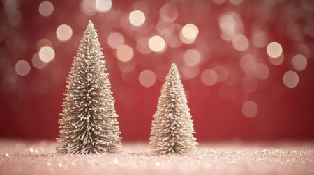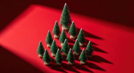 A festive arrangement of miniature Christmas trees on a vibrant red surface, creating a simple yet elegant holiday scene.