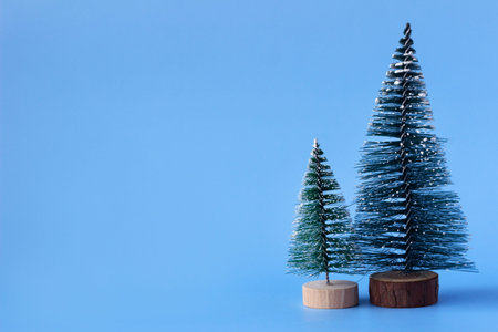 Two artificial Christmas trees on a blue background, place for text. New year concept