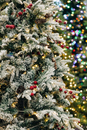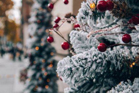 Pine tree with snow, glowing garland lights, red berries, green spruce branches abstract holiday background. New Year's 2023 selective focus. urban street scene. New year tree decorations backdrop.