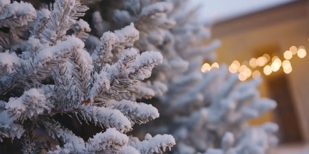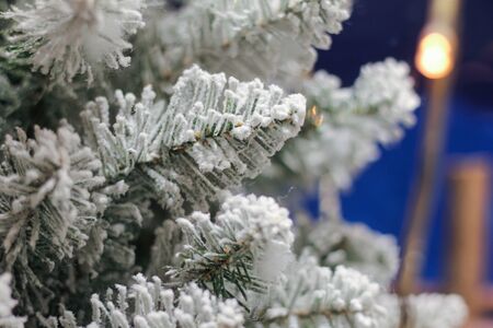 Close-up of snow-covered branches of spruce decoration for Christmas.