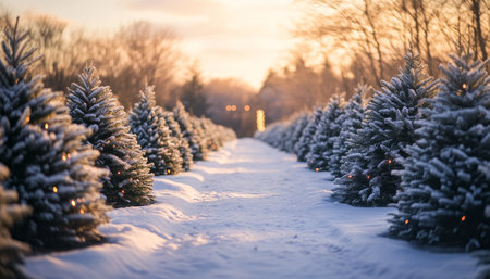 A serene winter sunset at a christmas tree farm with snowy path and twinkling lights