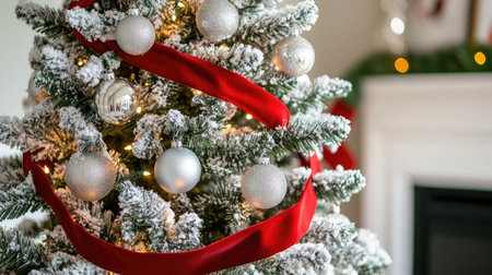 A beautifully decorated Christmas tree featuring silver ornaments, red ribbon, and warm lights, creating a festive atmosphere for the holiday season.