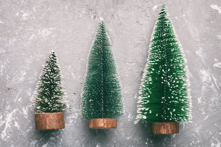 Toy coniferous trees decoration on white background. Flat lay, top view winter, christmas, new year composition.