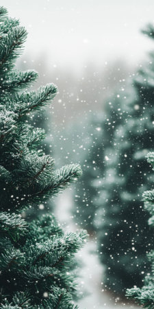 Snowfall Over Wintery Coniferous Trees in a Frozen Countryside, Creating a Serene Winter Wonderland