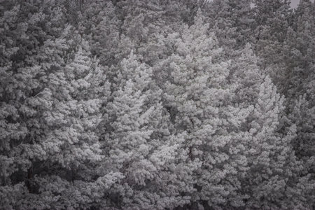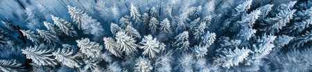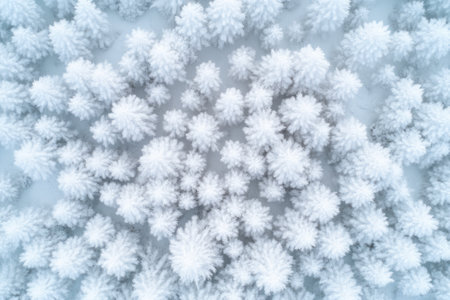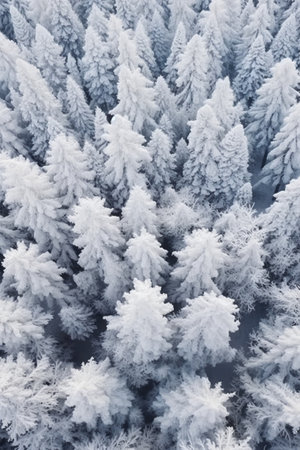 An aerial view of a winter forest scene filled with snow-covered trees. The image conveys tranquility and the beauty of nature during cold season, offering a serene atmosphere.
