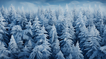 A stunning winter landscape featuring frosty pine trees layered against a soft blue gradient. This serene scene captures the beauty of nature in cold weather.