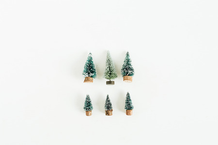Toy coniferous trees decoration on white background. Flat lay, top view winter, christmas, new year composition.