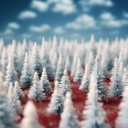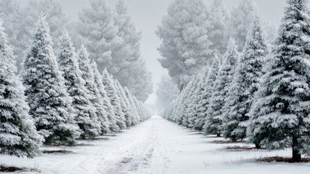 Majestic snow covered pine trees stand tall in a serene winter wonderland, creating a picturesque landscape