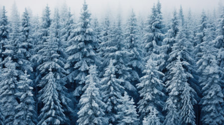 Stunning aerial view featuring a dense forest filled with snow-covered pine trees, showcasing the tranquil beauty of winter in a misty landscape.