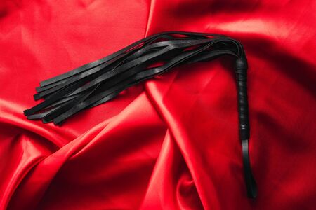 Red whip on a black silk background. Accessories for adult sexual games. Toys for BDSM