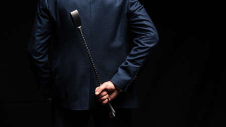male dominant holds a leather whip Flogger for hard BDSM sex