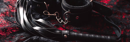 Bondage sadomasochism sex games erotic handcuffs and leather bdsm dominance whip.