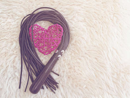 A black leather whip wraps around a red wicker heart on a fur background. Image in retro style to Valentine's Day