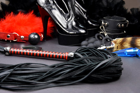 Leather flogger whip sex toys on a dark background stock photo images. Set of erotic toys for BDSM stock photo. Adult sex toy, flogger, ball gag, handcuffs, anal plug and high heel