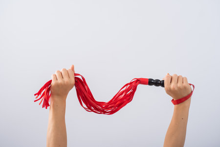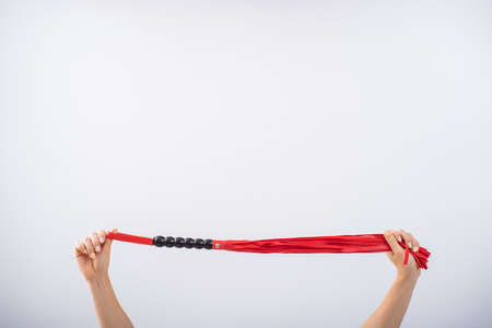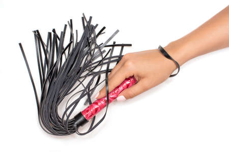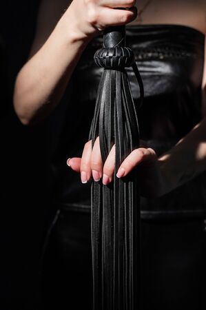 BDSM concept. A woman in a leather dress holds a black whip with a long fringe. Role-playing games for adults. Close-up of sex toys for domination.