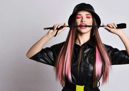 Young pretty sexy woman with pink hair and bright makeup in black leather jacket and hat standing and biting whip with eyes closed