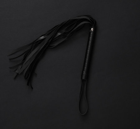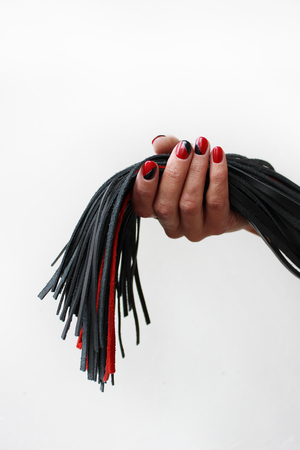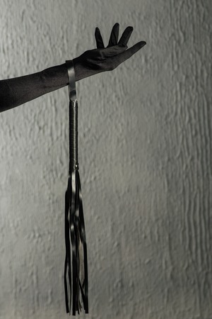 Black leather lash in the hands of an unrecognizable woman. Cropped photo of bdsms toys. Punishment and pleasure.