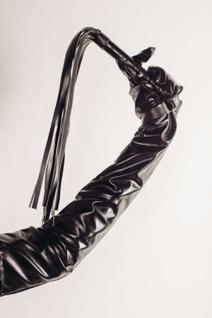 Woman's hand in a satin glove holding a whip . Bdsm outfit - image