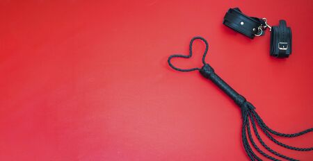 Accessories for bdsm on a red leather background. Lash in the shape of a heart and leather handcuffs. Erotic shop. Valentine's Day. Copy space.