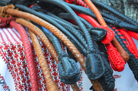 Whips for BDSM on a dark background. Accessory for sexual games.