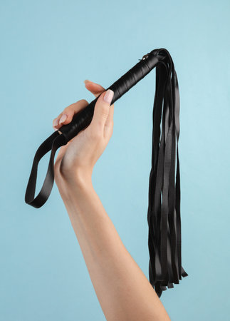 Female hands holding a leather whip on blue background. BDSM accessories, domination, sex games