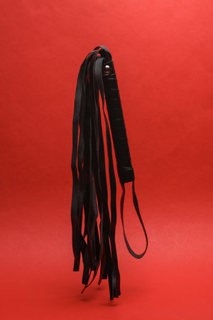 Leather sex whip levitating on red background. dominance. sex games. floating objects