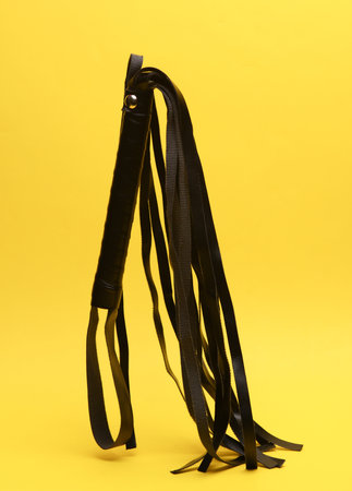 Leather sex whip levitating on yellow background. dominance. sex games.