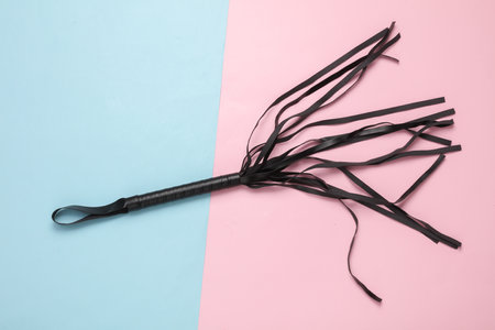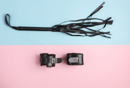 Leather whip with handcuffs on a blue-pink pastel background. Sex games, domination, bdsm