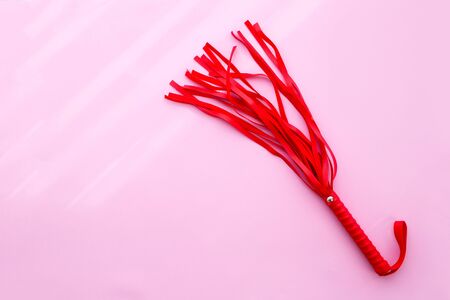 Leather red whip on a pink background. Sex toy. Flat lay, copy space.