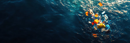 Brightly colored plastic debris is floating on the dark blue waters, highlighting the growing issue of ocean pollution and waste.