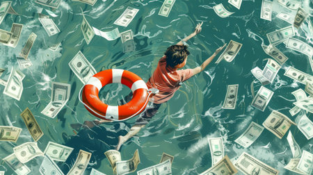 A young person floats in a sea of dollar bills, clutching a lifebuoy, symbolizing financial abundance or economic rescue.
