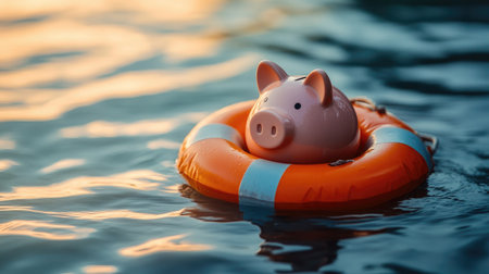 Financial protection: A piggy bank floating in a lifebuoy on water, symbolizing financial risk management and protection.