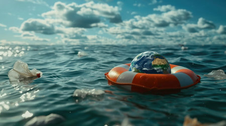 Planet earth with a life preserver around in the ocean. Planet Earth lies on a life preserver. Grug floats in the water. Garbage floats in the water. environmental pollution