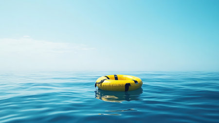 A bright yellow life ring gently floats on serene ocean waters, surrounded by expansive blue sky, representing safety and calm in summer settings.