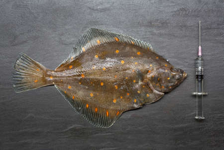 Fresh fish with syringe on counter
