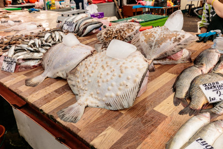 fresh turbot fish on the market stall for sale