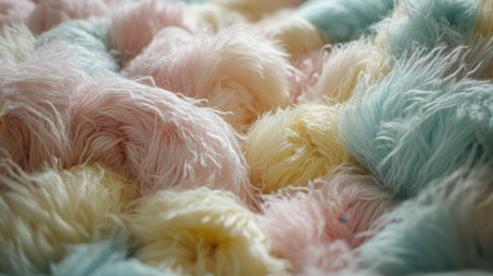 This image features a close-up of a soft and colorful textile made of pastel yellow, pink, and blue fibers. The fluffy texture adds warmth and comfort, making it ideal for cozy home decor projects or lifestyle aesthetics.