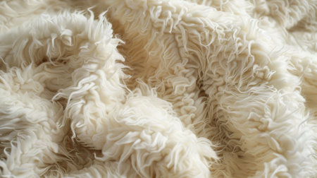 A close up of a fluffy white sheep's fur. The fur is very soft and has a lot of texture, giving it a cozy and warm appearance