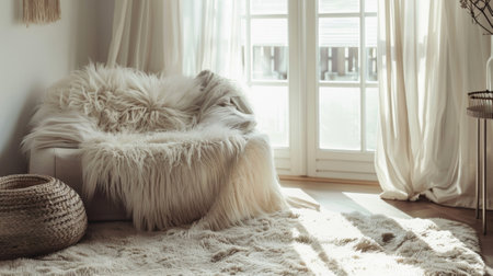 A peaceful workspace with a plush loveseat a fluffy sheepskin rug and soft natural light filtering through curtains