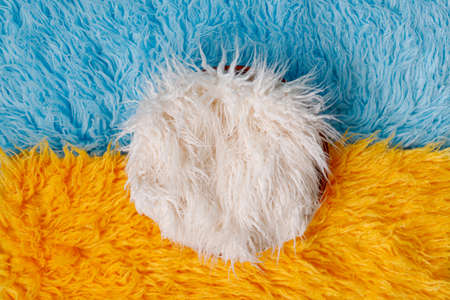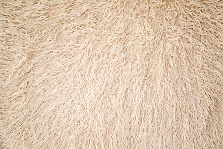 Background picture of a soft fur white carpet. wool sheep fleece closeup texture background,Fake color beige fur fabric. top view. 2019
